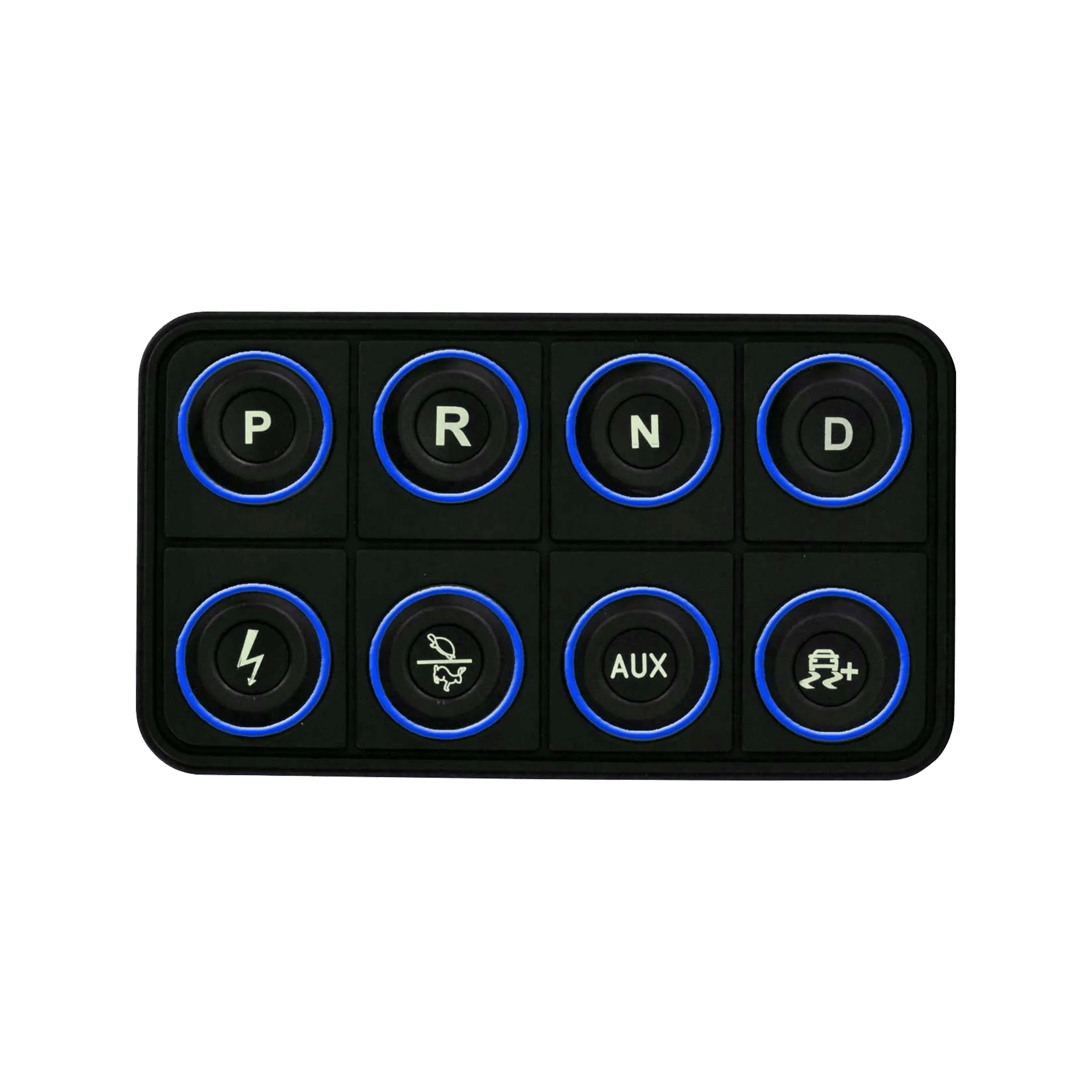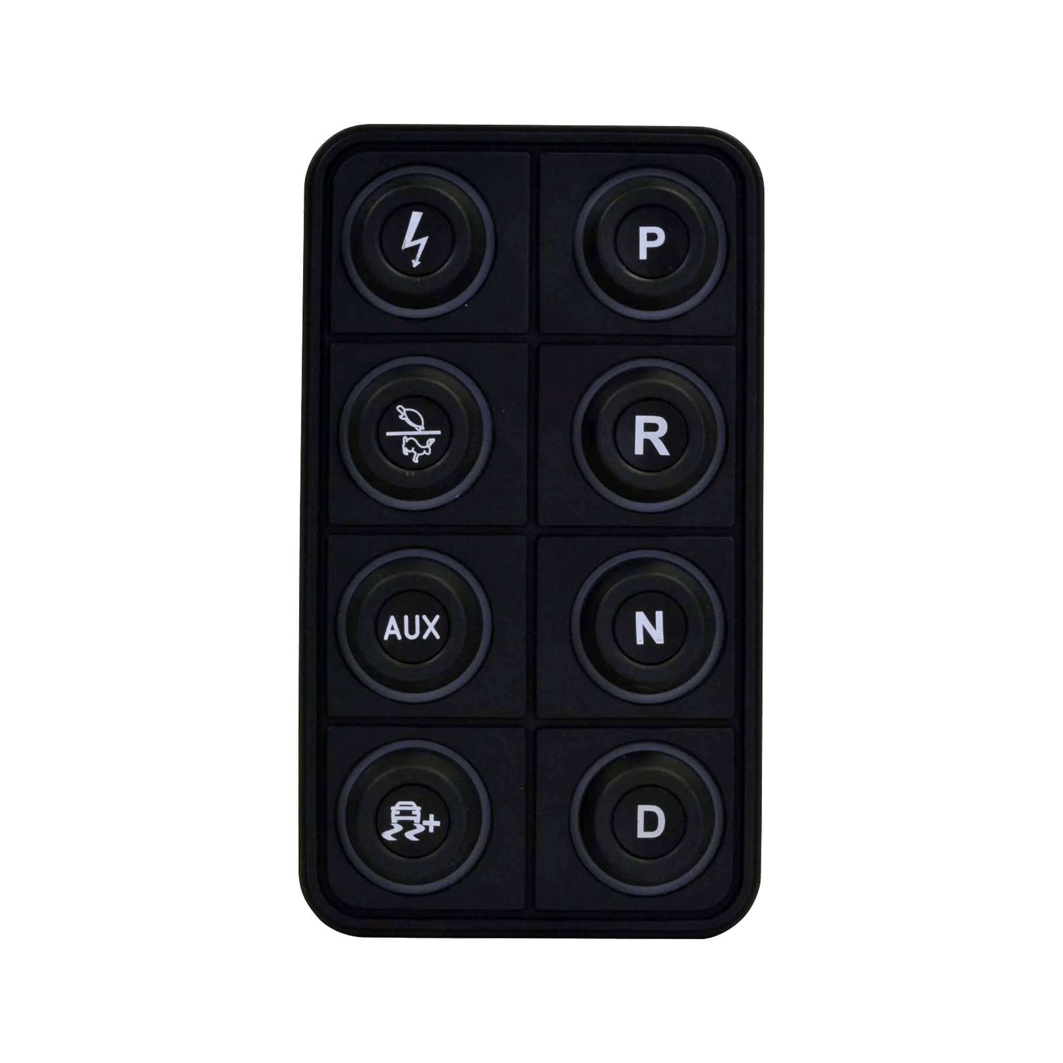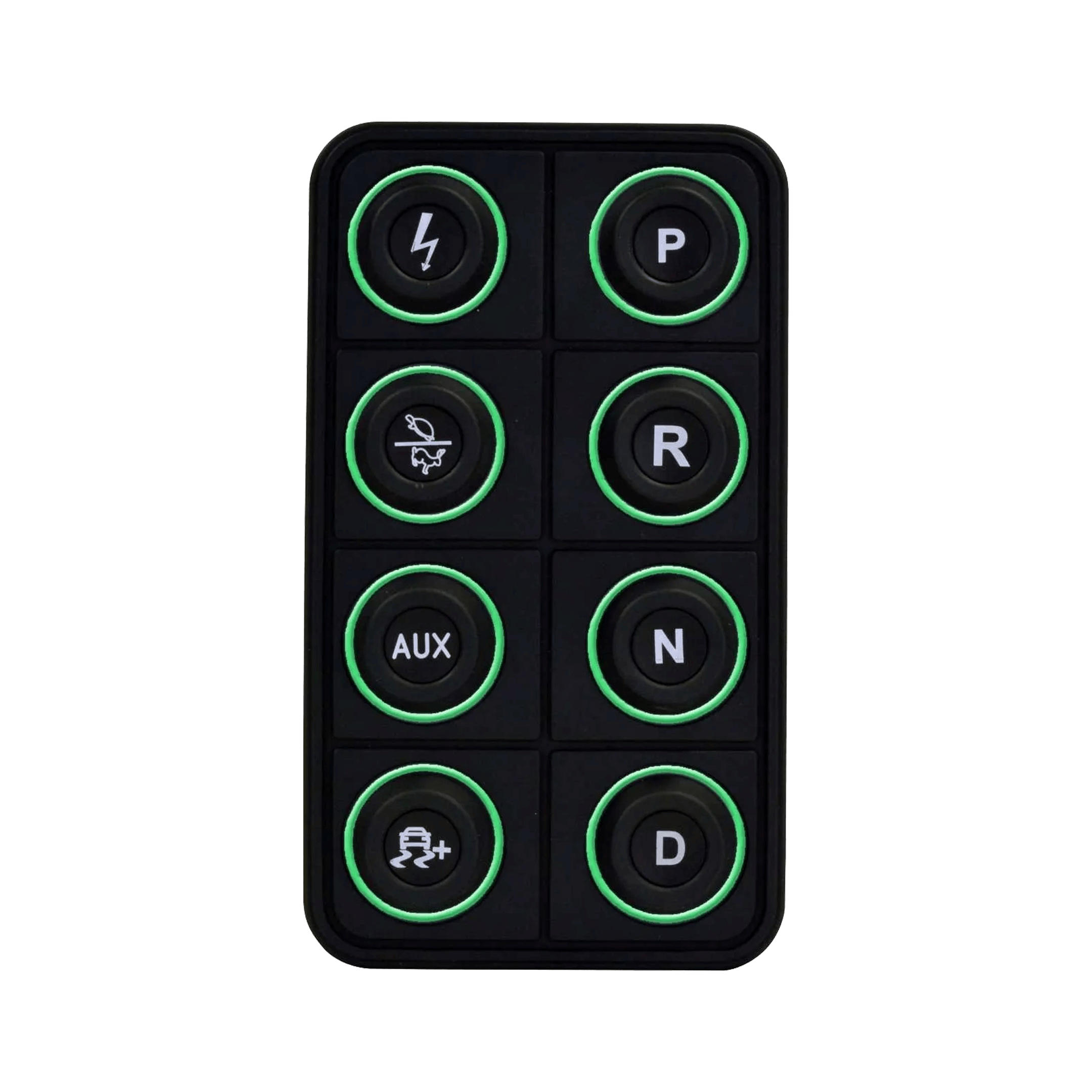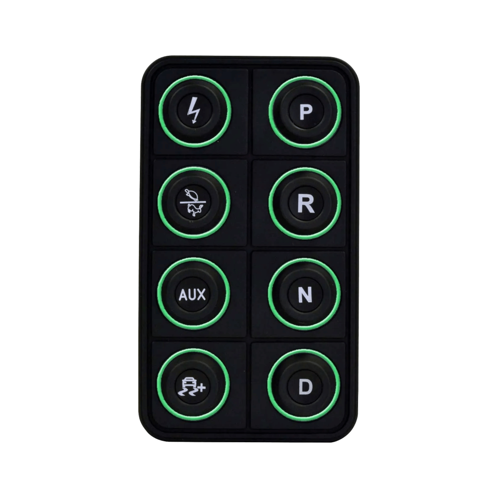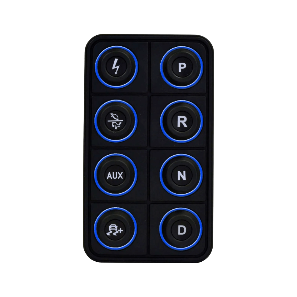 The AEM EV 8-Button CAN Keypad (PN 30-8400) puts control at your fingertips in EV street-conversion and motorsports vehicles. It is a VCU expansion device that allows you to control vehicle functions by programming them in the VCU software, and then send these commands via CAN bus to a VCU200 or VCU300 Vehicle Control Unit. Functions like Ignition, Park, Reverse, Neutral and Drive, as well as two map switching functions like performance level and traction control, are all controlled from a central location through a sleek, vibrant interface.