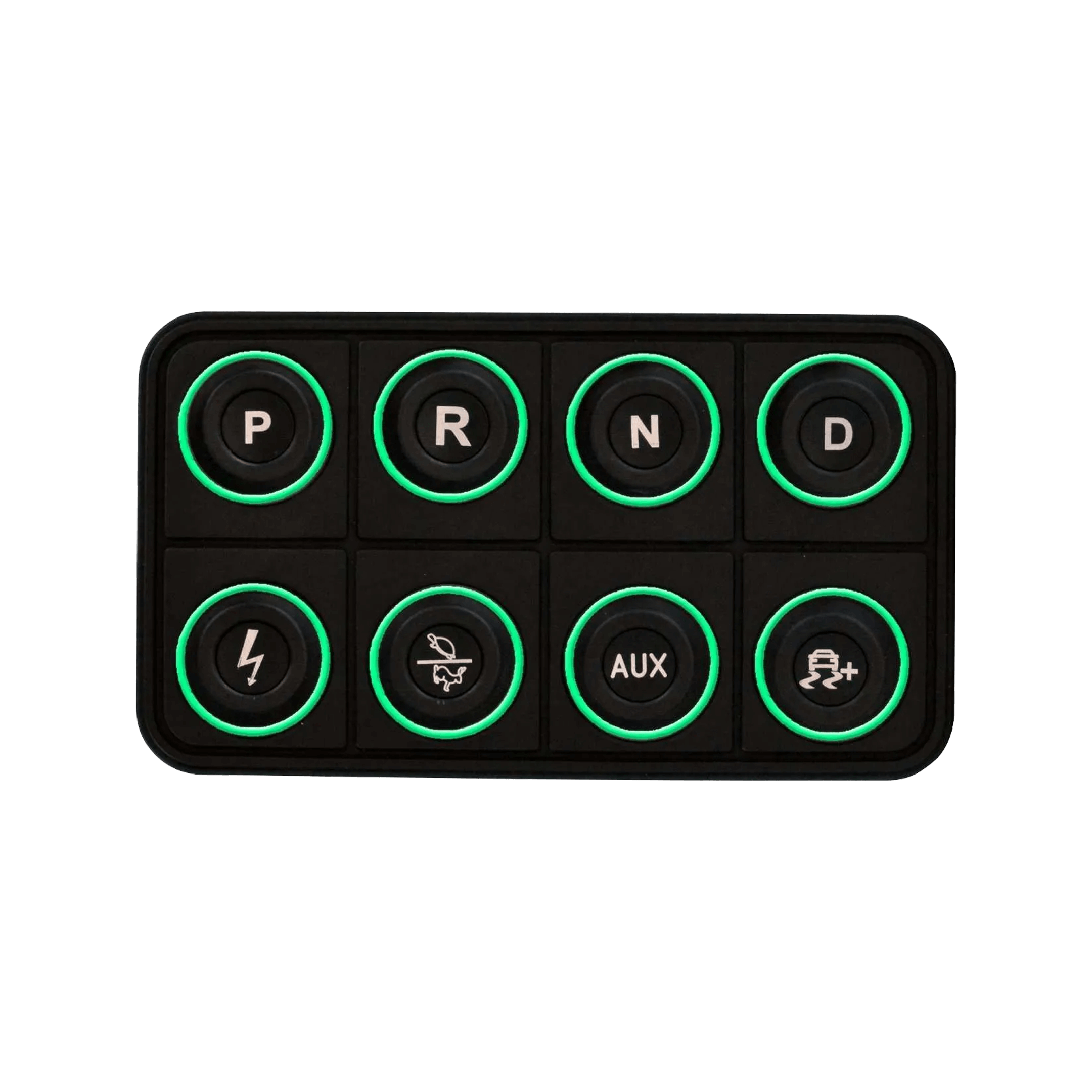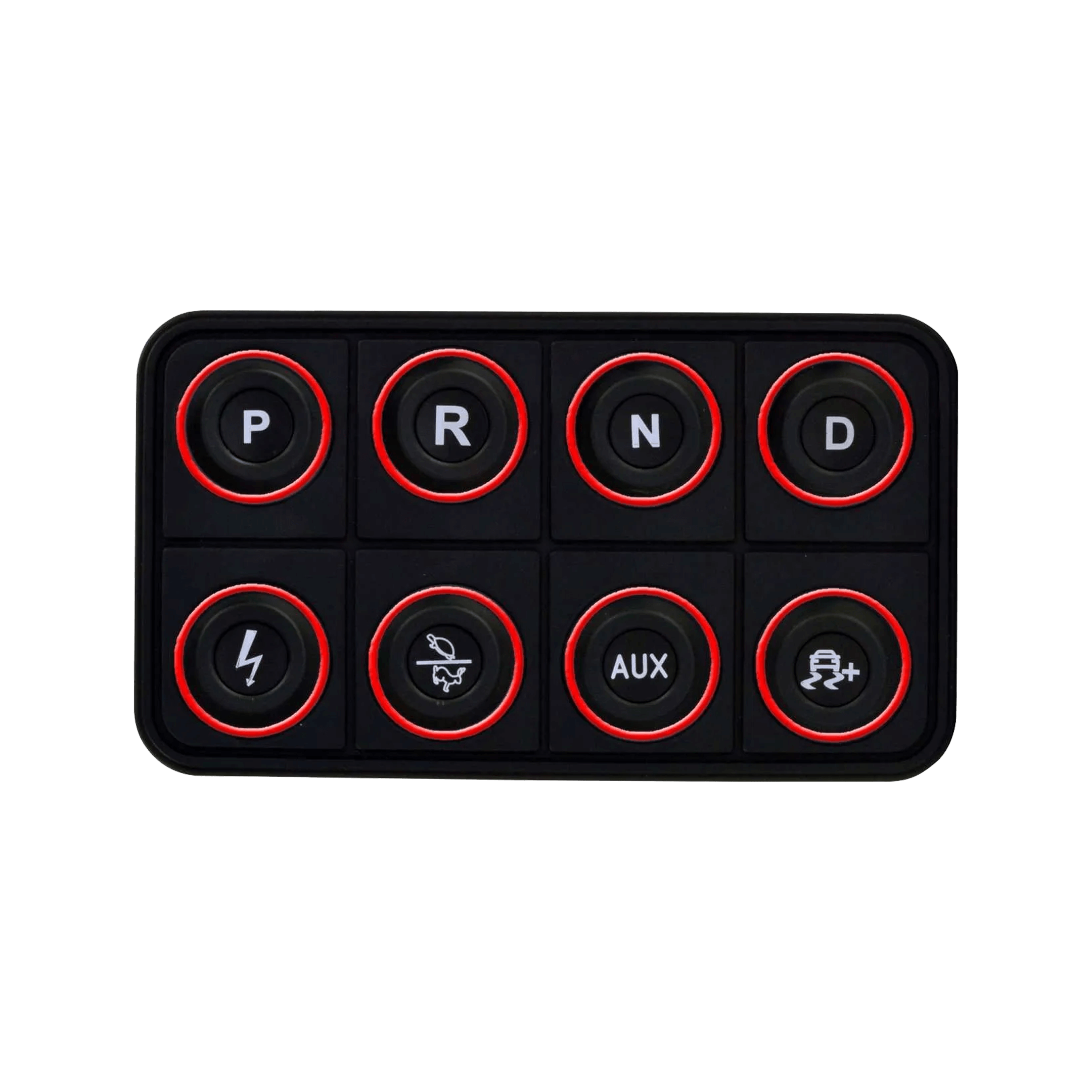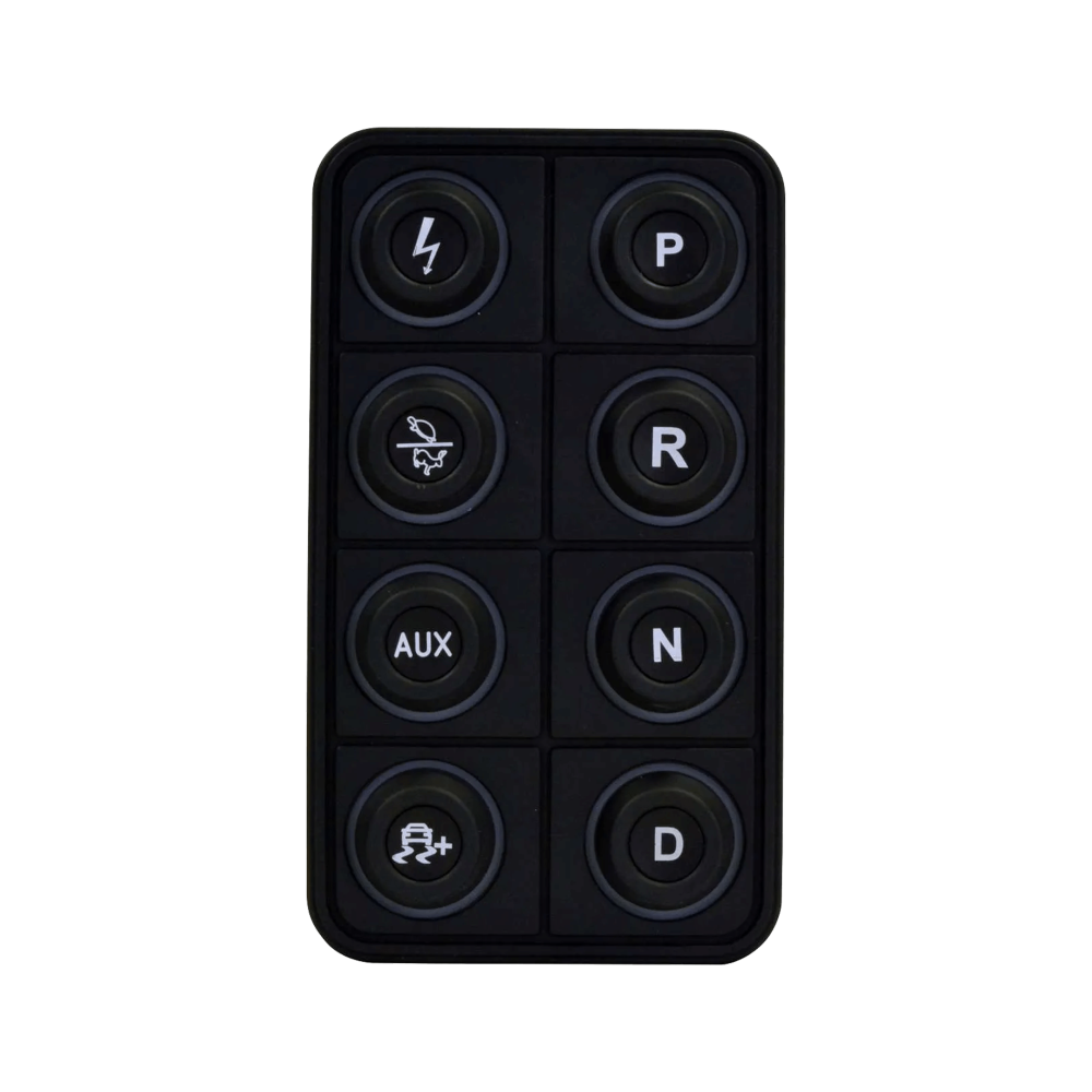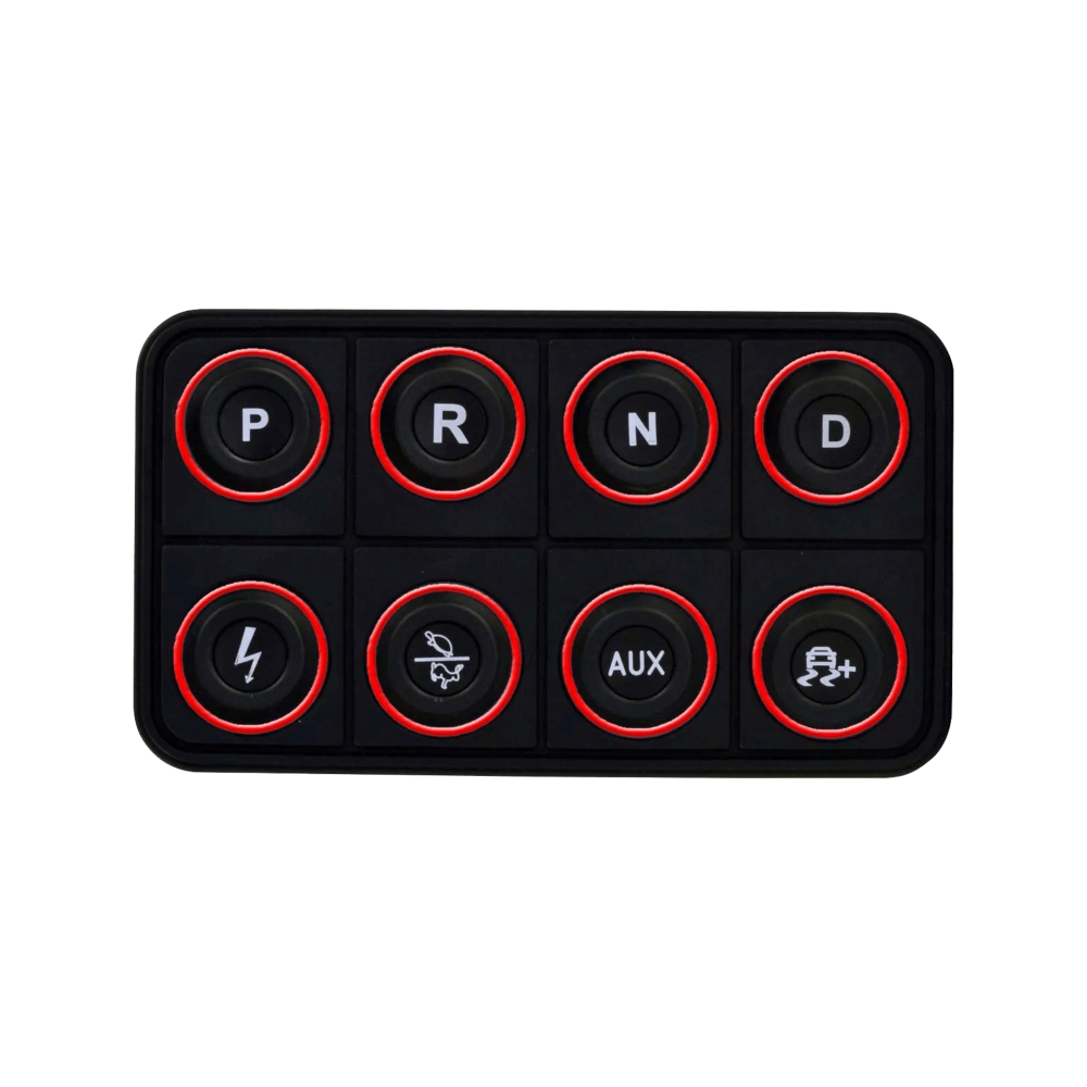 The VCU200 supports direct-drive only, and the button functions are fixed. The top row of buttons control P, R, N, and D, and the bottom row buttons control ignition, performance level, auxiliary control for a dedicated 20 Amp PDU output, and traction control slip target (coming soon).