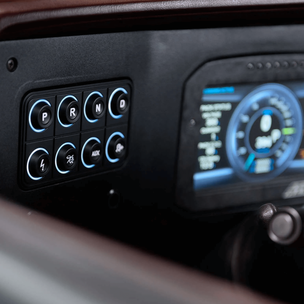 More than just aesthetics though, the backlighting is used to alert you to any potential issues and whether everything is functioning properly to keep you safe. For instance, when the Ignition switch is pressed three color states verify that everything is working correctly. When the contactors are open there is no backlight, and when the pre-charge process begins the backlight turns yellow. Once the pre-charge process is complete and the contactors close the backlight turns green to notify you that the vehicle is safe to operate, and if a fault is detected the backlight turns red.